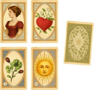 人物カードの向きが左右を向いているため、現在・過去・未来の状況や、相手の意識が驚くほど分かりやすく読み解けます。雲のデザインも曖昧さがなく、吉凶のコンビネーションリーディングがスムーズです。